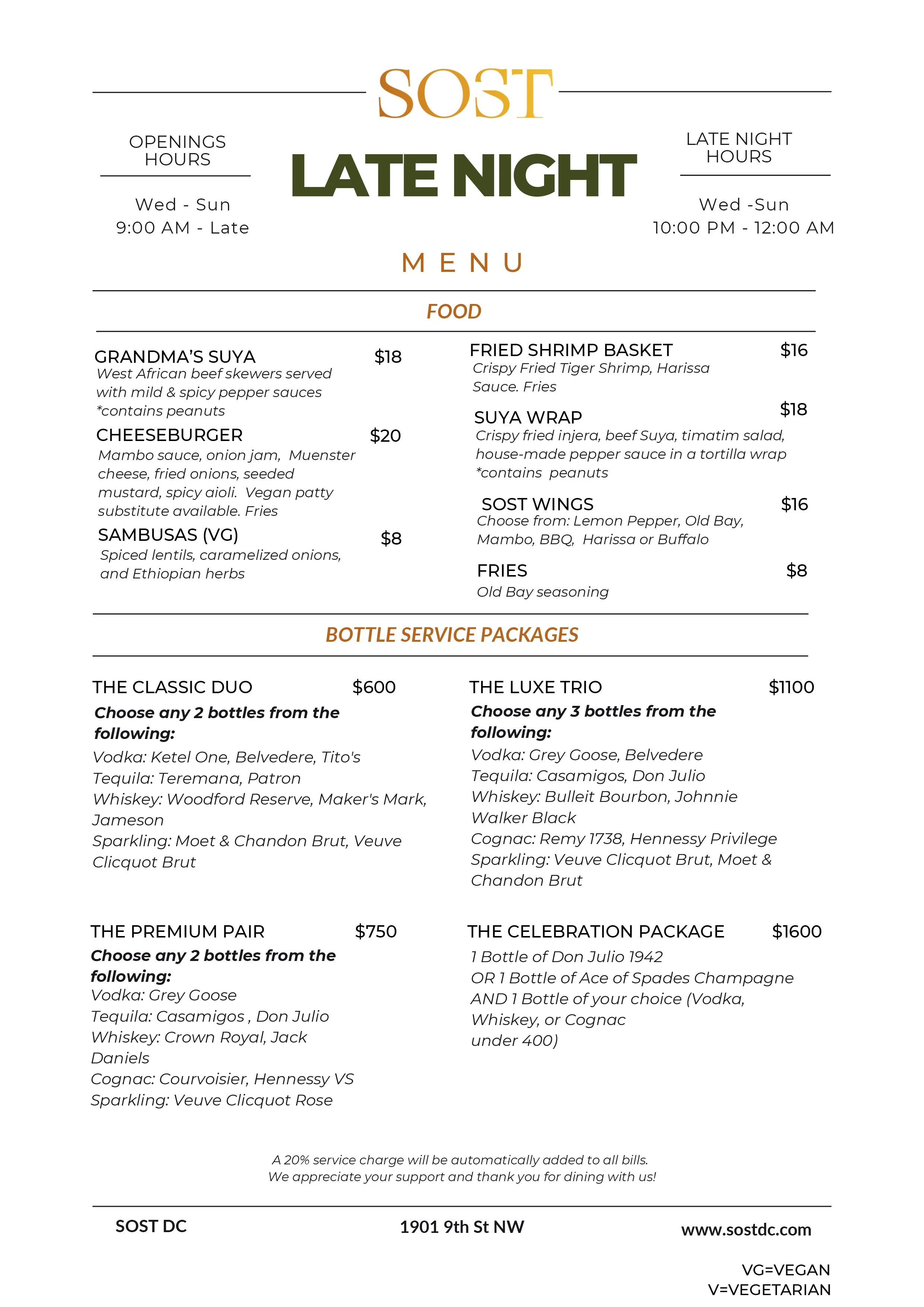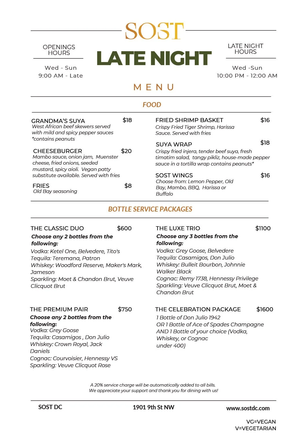 ——— DINE-IN ——— Cafe Lunch Happy Hour Dinner Brunch Drinks Bottle Service Late Night Make a Reservation LATE NIGHT
